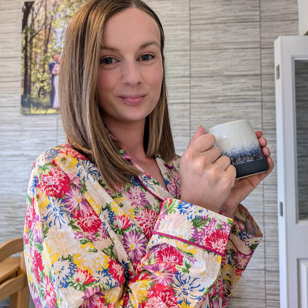 'I'm a sucker for tartan. There's something about it that screams cosy nights in with a movie and a hot chocolate. Something I'm all for, even in the height of summer! I really liked the colouring in this print. The warmness of the yellow, mixed with the cooler blues and greens really makes me happy. And I'm even happier wearing them! The brushed cotton is super soft and not to sound like Goldilocks, but I'm neither too warm nor too cold wearing them. I really love the tie waist on the trousers. And they have pockets! I repeat, they have pockets! The rounded collar gives that put together look you get from a traditional PJ set, with a more comfortable and cosy feel to it. Relaxing never felt so good!'