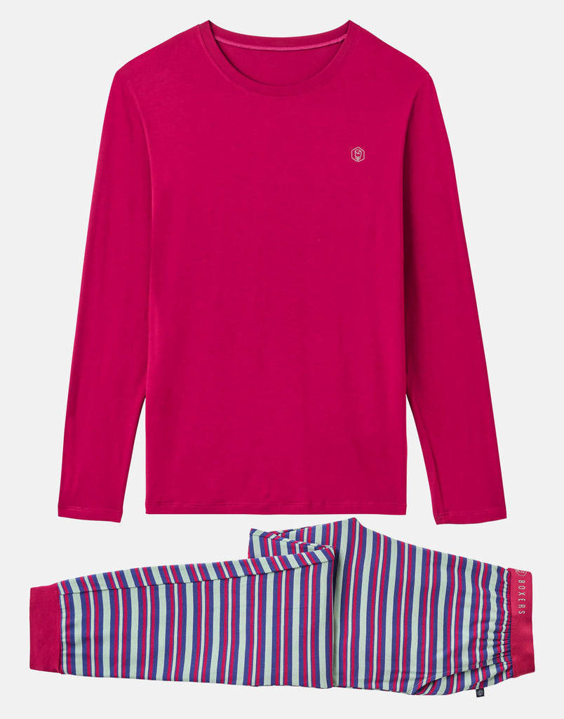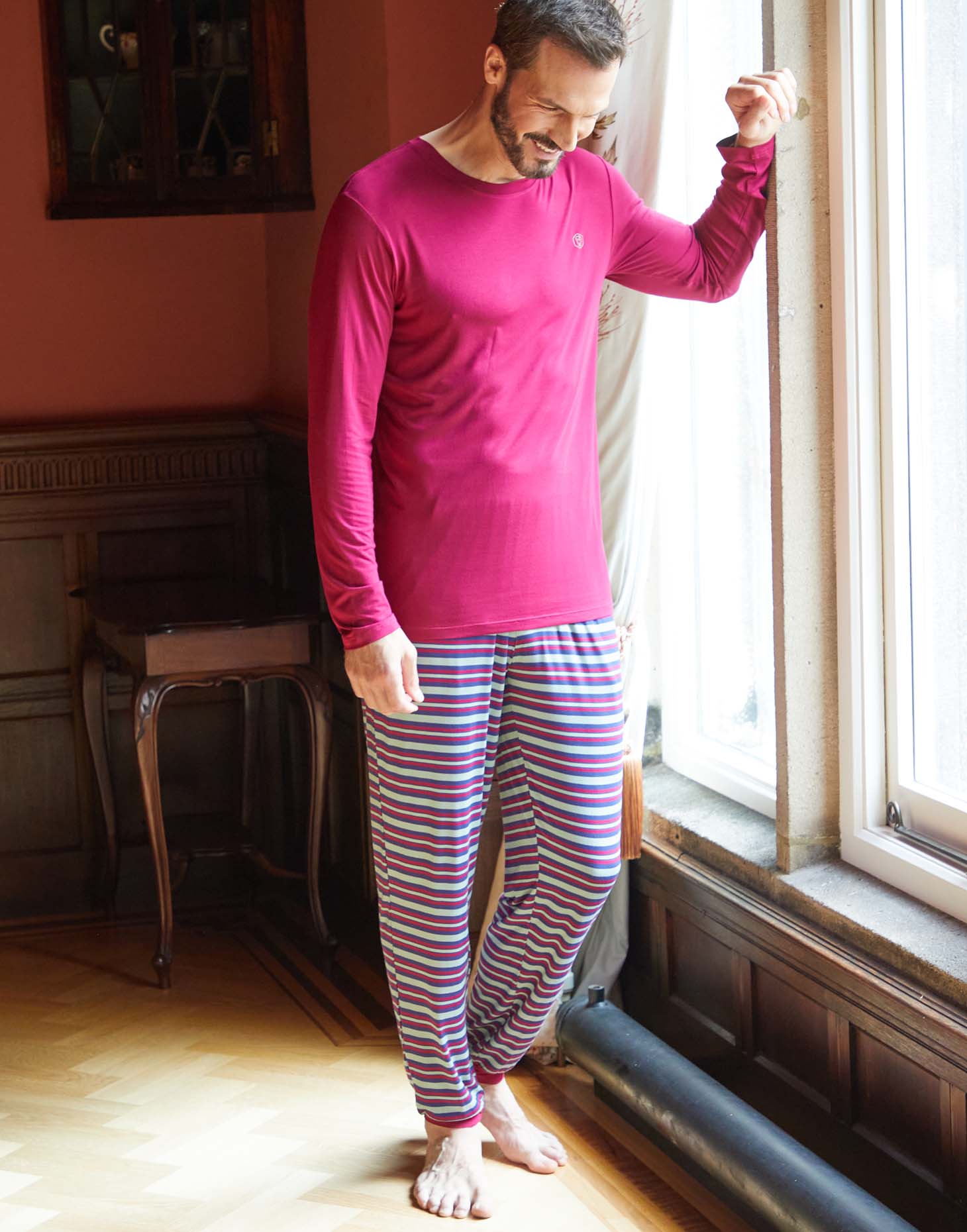 These men’s bamboo pyjamas in a forest berry stripe pattern offer a perfect balance of comfort, style, and nature-inspired charm. Crafted from soft, breathable bamboo fabric, they are naturally moisture-wicking and gentle on the skin, ensuring a cosy night’s sleep. The long-sleeve top features a relaxed fit, accented with a rich forest berry colour. The matching trousers are designed with an elastic waistband for a flexible, comfortable fit in an enchanting stripe pattern that evokes the vibrant hues of the woods. Ideal for lounging or winding down, these pyjamas bring a touch of earthy elegance to your sleepwear collection.
