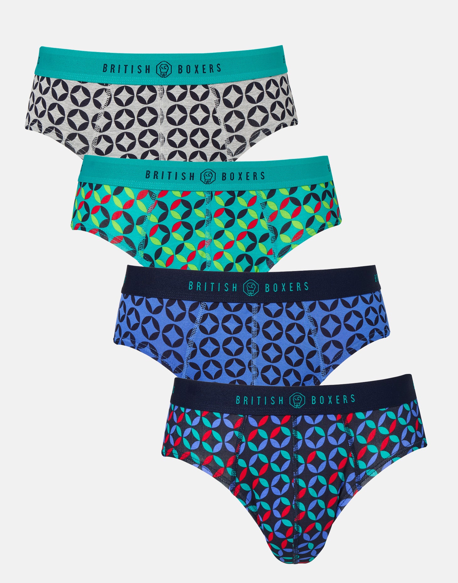 Choose your size and receive 4 pairs of bamboo fabric briefs in Geometric Stone, Metric Blue, Heritage Geo and Geo Flash.