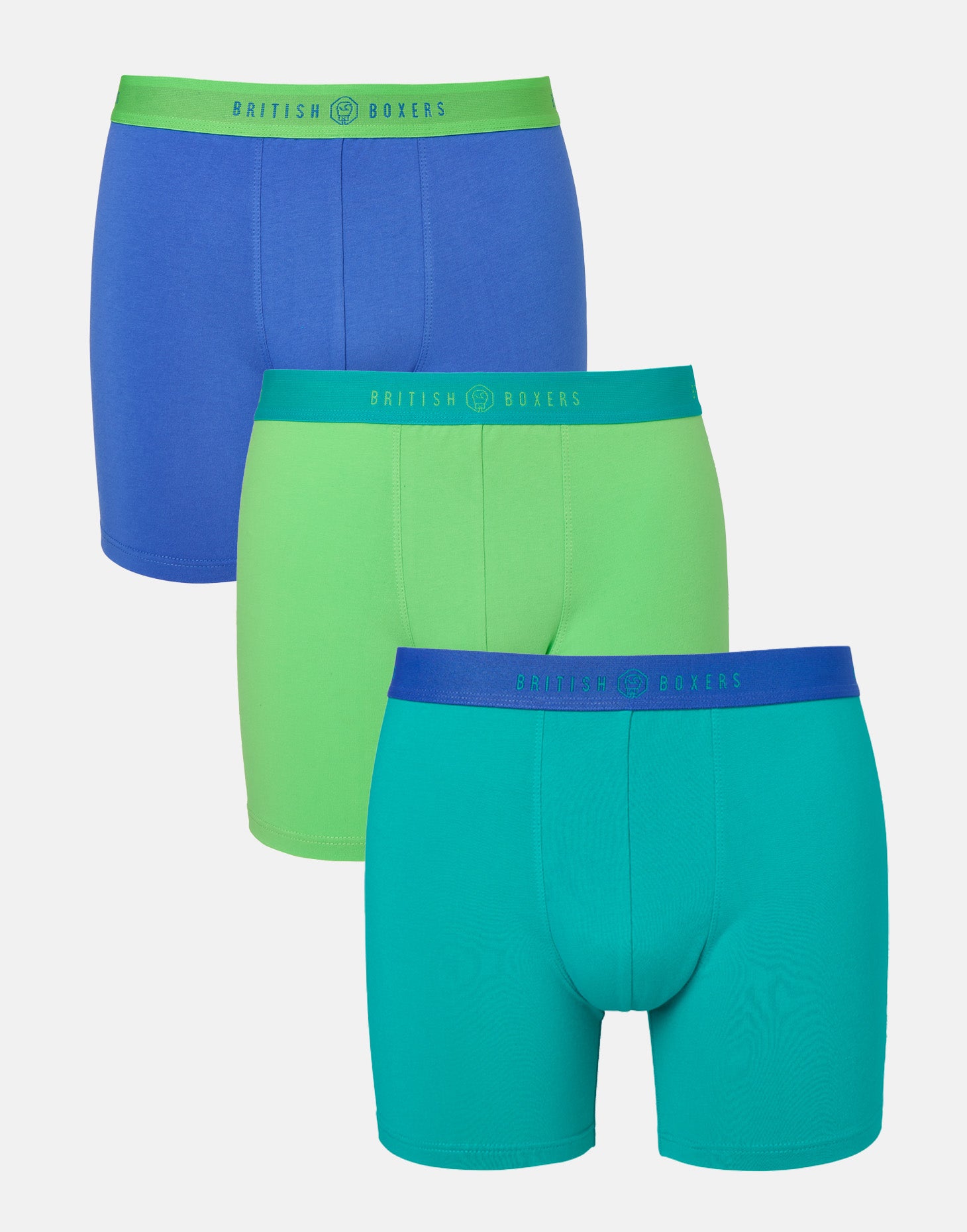 Choose your size and receive 3 pairs of stretch trunks in - Key Lime Blue, Blue Zinger and Lime Spritz.
