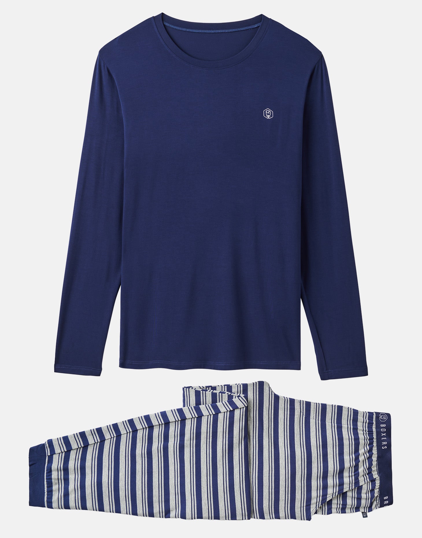These men’s bamboo pyjamas in a sleek navy melange stripe offer the perfect blend of style and comfort. Made from soft, bamboo fabric, they are breathable, moisture-wicking, and gentle on the skin, ensuring a cosy night's sleep. The pyjama set features a classic long-sleeve top with a modern, relaxed fit and matching pants with an elastic waistband for ultimate comfort and flexibility. The subtle navy melange stripe adds a touch of sophistication, making these pyjamas perfect for lounging at home or winding down after a long day. Stay stylish and comfortable with these luxe pyjamas.