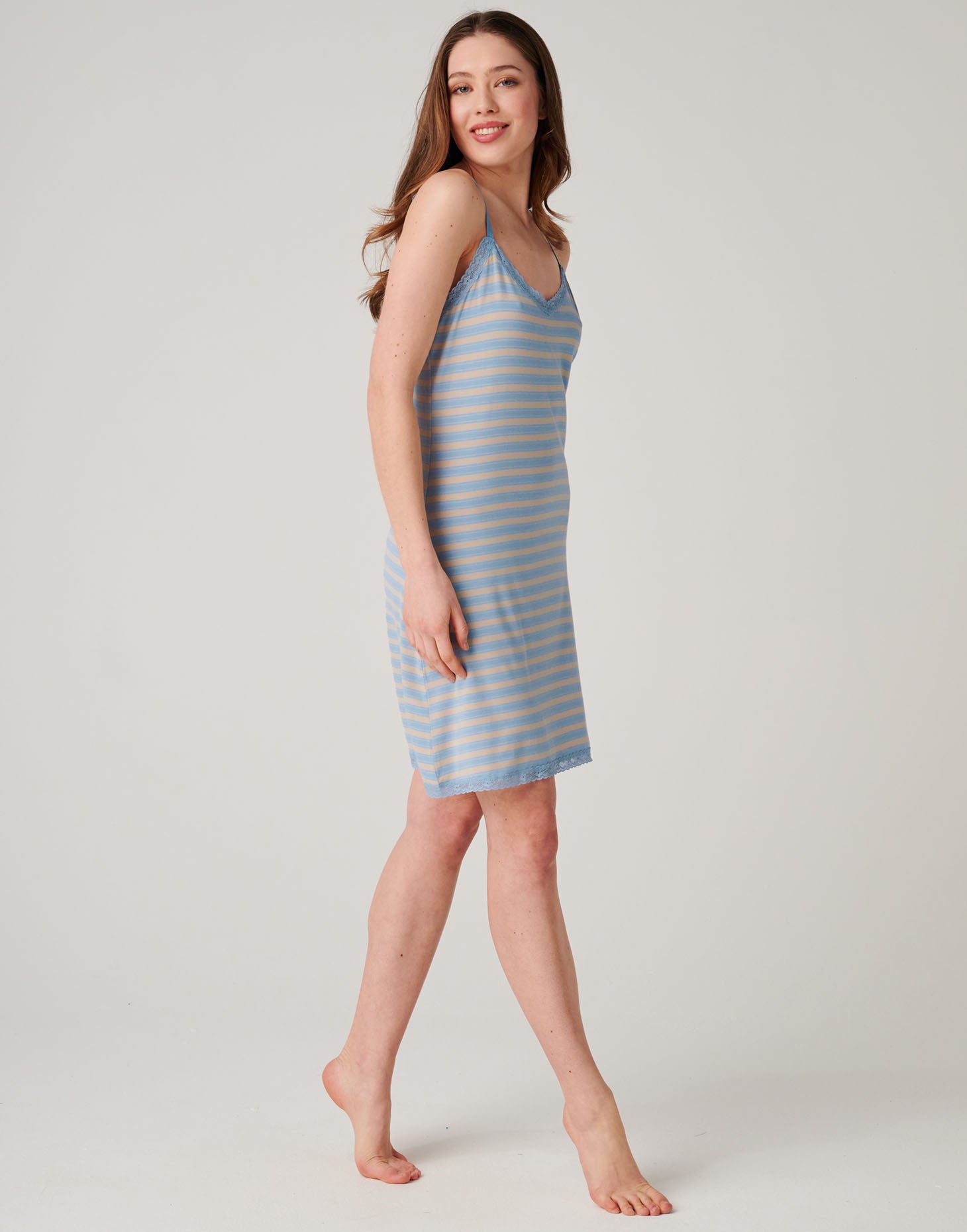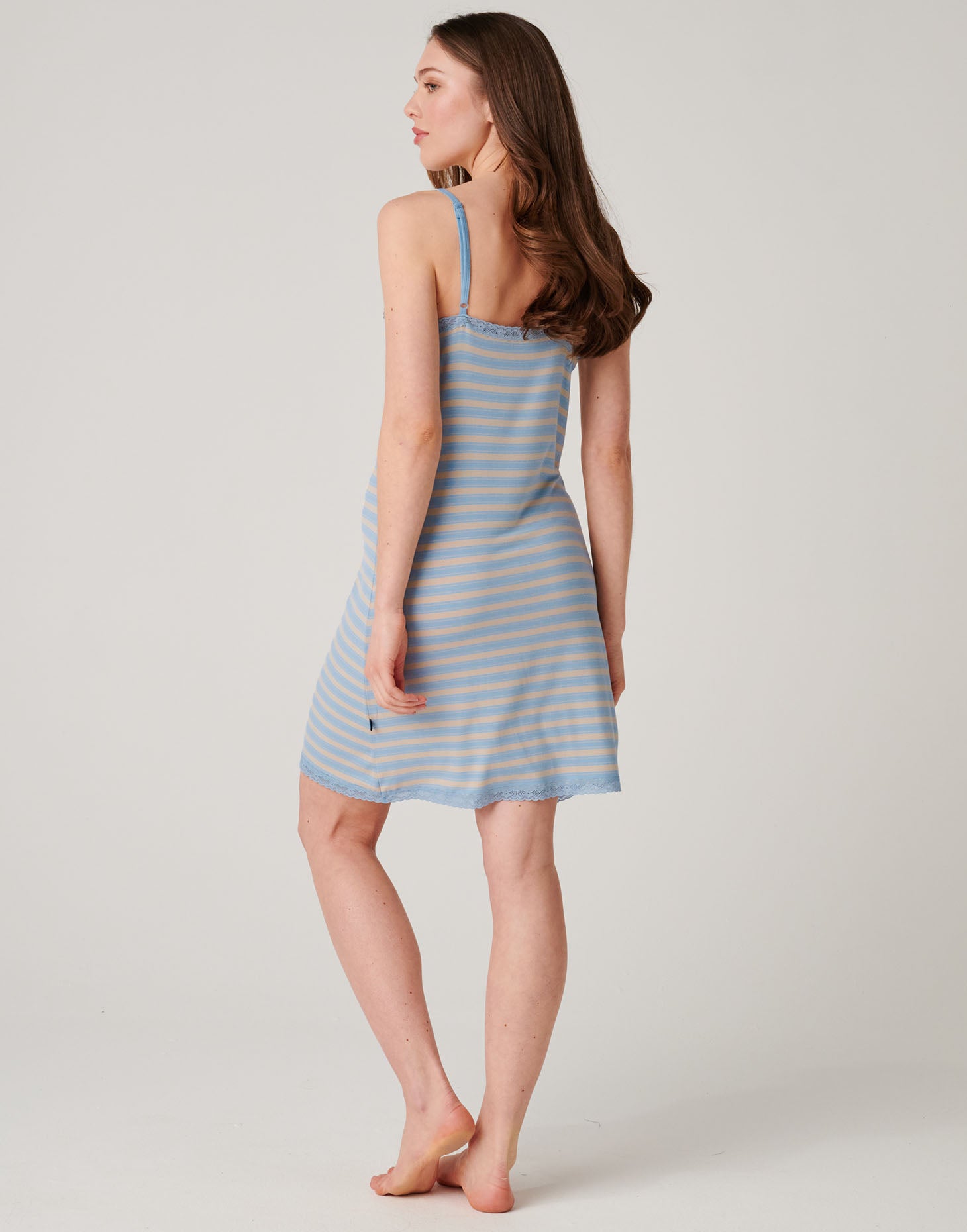 Our Bamboo Lace Strappy Nightdress in Cornish is the perfect blend of comfort and effortless elegance. Designed with delicate adjustable straps and pretty lace detailing, it has a softly flattering shape that feels light and easy to wear. Made from ultra-soft, breathable bamboo fabric, it drapes beautifully against the skin with a smooth, silk-like feel. The sand and baby blue Cornish stripes bring a fresh, coastal-inspired touch, while the naturally moisture-wicking fabric keeps you cool and comfortable through the night. Ideal for sleeping, lounging, or slow mornings at home — light, feminine, and an absolute joy to wear.