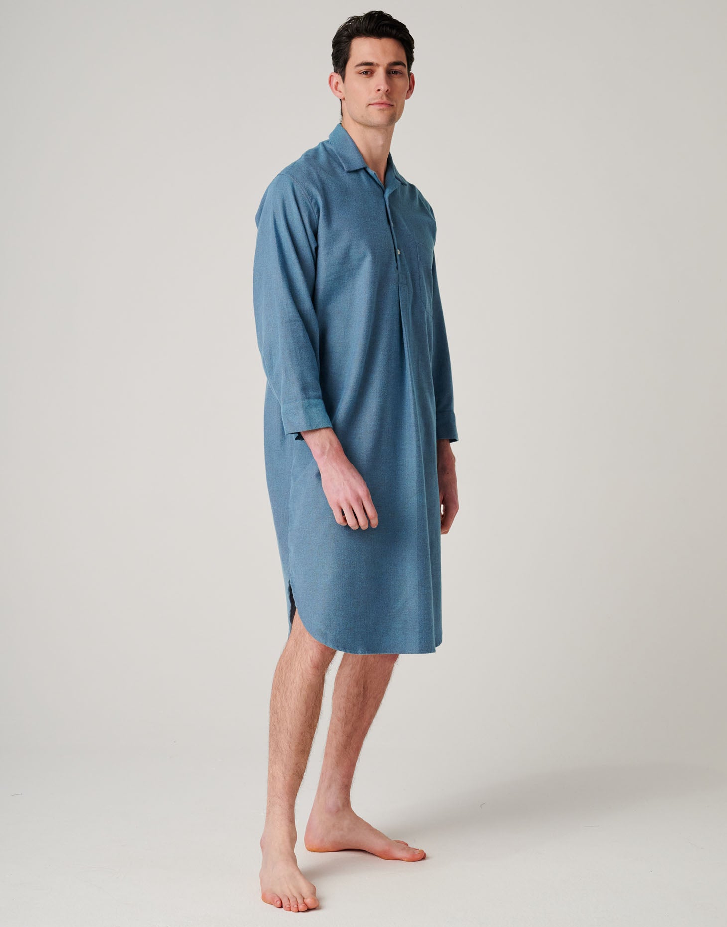 An absolute classic. For lounging or sleeping, this charming nightshirt offers a roomy fit for great freedom of movement and comfort. It's crafted from the softest brushed cotton, which is woven to our exact specifications, the fibres brushed repeatedly to feel wonderfully luxurious against the skin. This fabulously soft brushed cotton incorporates a wonderful teal and wine coloured mix woven into a subtle herringbone design. Giving a nod to the traditional weaving often found in the far reaches of Scotland and made to a timeless design, this nightshirt is finished to perfection with French seams, a pocket and a three-button neck opening and a breast pocket