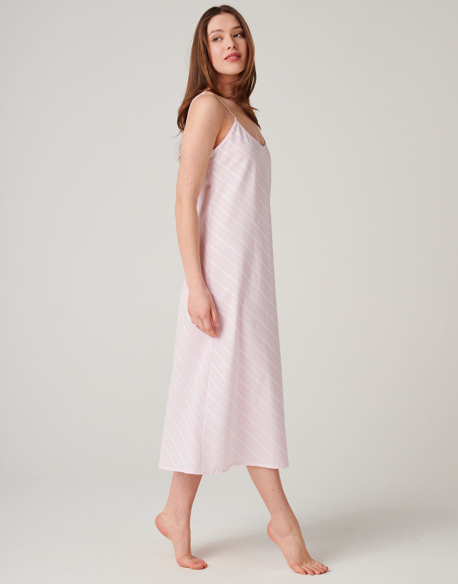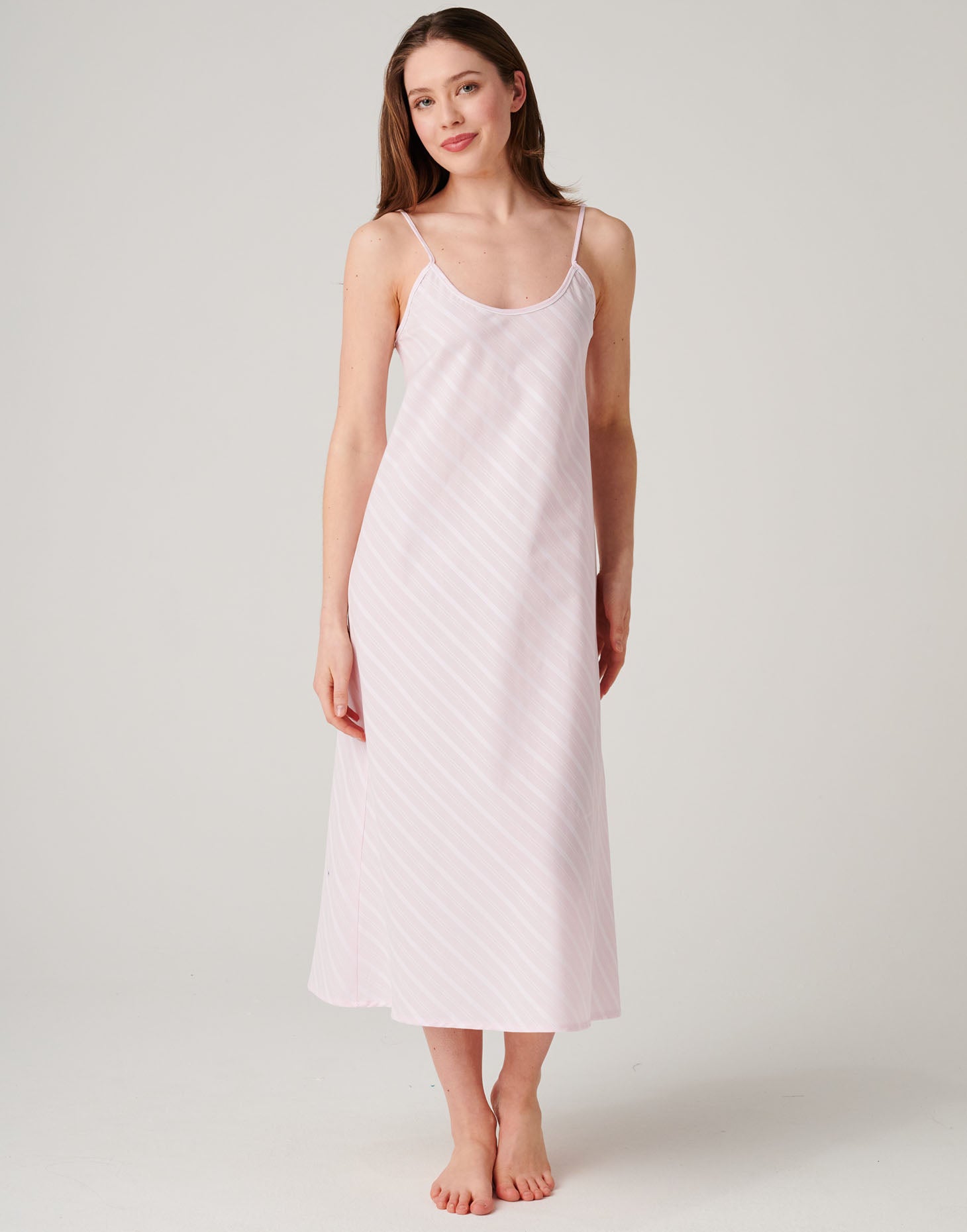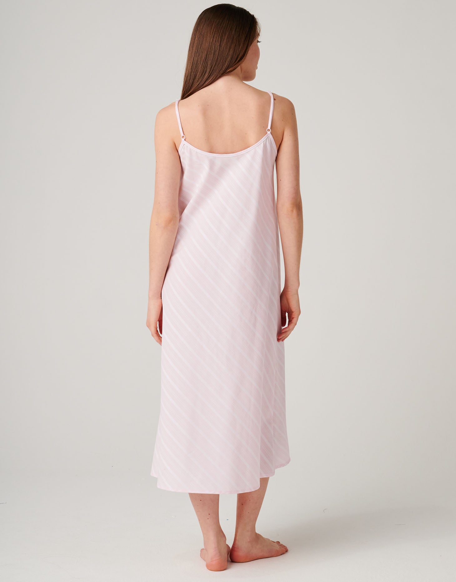 Women's Crisp Cotton Strappy Nightdress – Shell Pink Satin Stripe - PETITE is backordered and will ship as soon as it is back in stock.